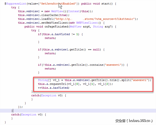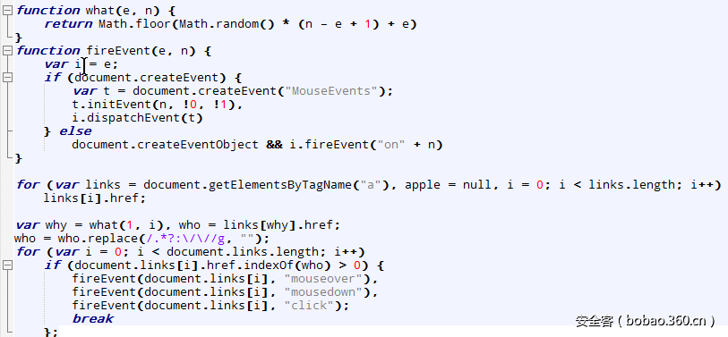 该病毒对这些数据的处理方式是,使用WebView加载返回URL,然后在页面加载完成后,执行那段JS代码,JS代码的功能是从页面中所有的URL link(通过查找html的a标签获得)中,随机挑选一个,模拟鼠标事件进行点击,实现代码如下: