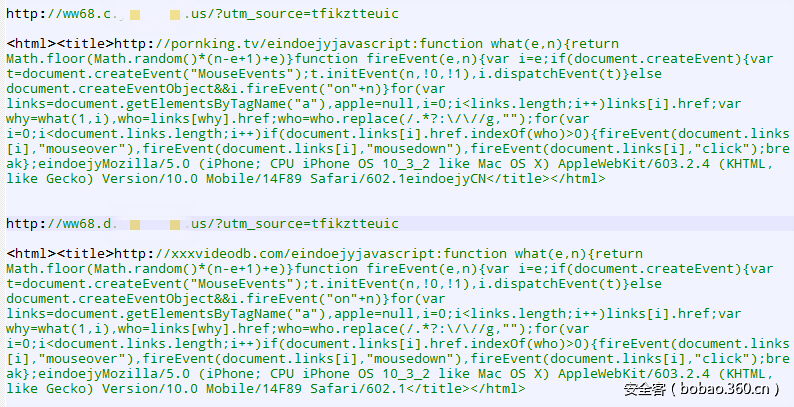 请求这两个URL返回的数据是类似的,都是在HTML的title中设置了一段内容,这段内容使用一个硬编码的字符串(比如”eindoejy”)分隔成3或者4部分,前3部分都是一样的,一个URL,一段JS代码,一个UserAgent,后面可能还有一个字段,猜测为国家名字缩写,该样本中为CN(代表中国?)。请求你的地址和返回的数据,类似下图: