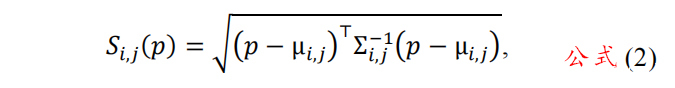 由于来自相邻通道的EMG信号之间有很高的相似性,提取的特征会有很高的相关性。考虑到特征之间相关性,Mahalanobis距离被考虑用于生物识别比较[6, 7, 11]。对于一个给定的特征向量样本P,即一个特定用户(申请人)在做特定手势时的输入,其与ith手势和jth用户的匹配分数Si,j,被定义为样本和类中心点之间的Mahalanobis距离: