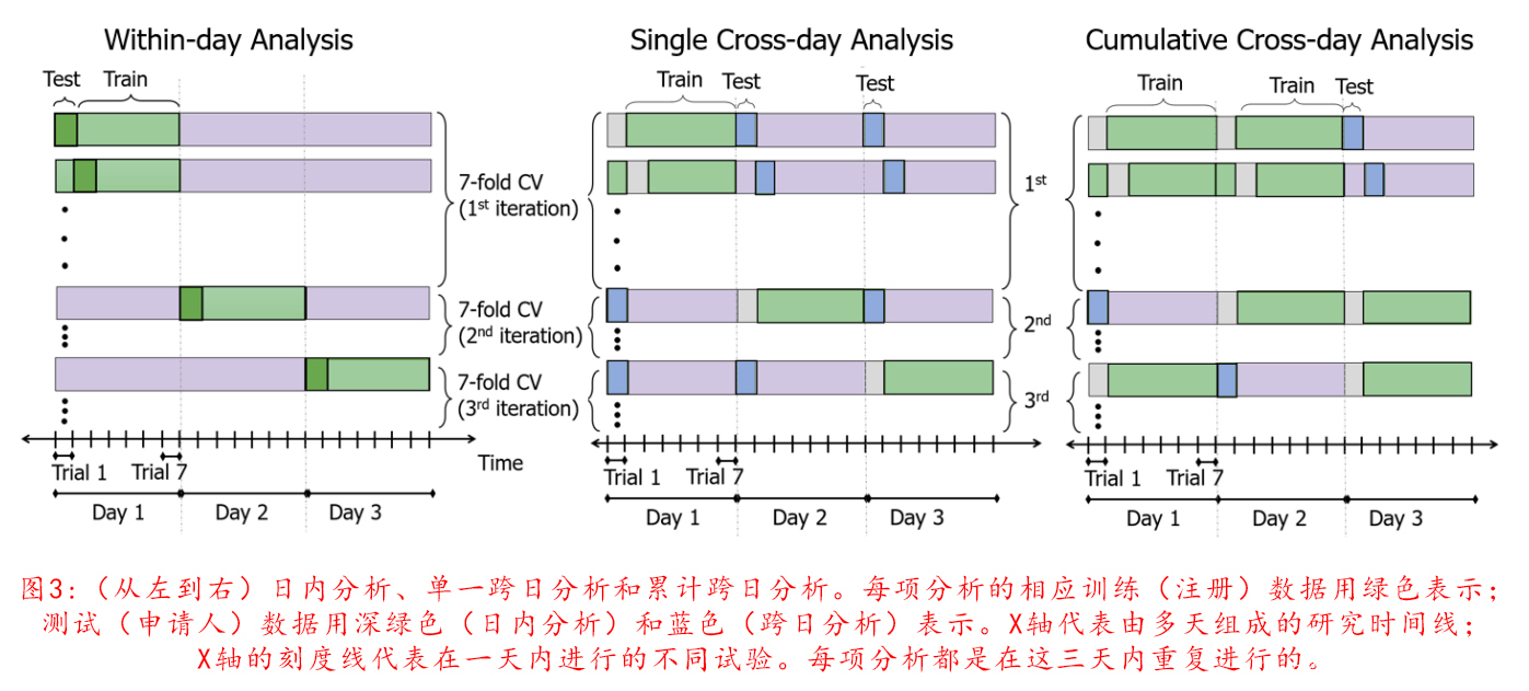 对于单一的跨日分析,一天中的六次手势试验被用作登记数据,其余两天中每天的一次试验数据被用作申请人数据。这个步骤重复了七次,通过改变特定日期的登记和申请人试验,从而产生了重复的七次交叉验证。每天重复交叉验证三次,并报告平均认证性能。