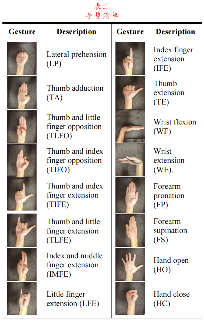 仪器设置完成后,受试者舒适地坐在椅子上,双上肢呈休息姿势。在参与者面前放置的电脑屏幕上,提供了执行这些手势的视觉指示。目前的研究包括以下16种手部和手腕姿势(见表三):侧抓握(LP),拇指内收(TA),拇指和小指对握(TLFO),拇指和食指对握(TIFO),拇指和小指伸展(TLFE),拇指和食指伸展(TIFE),食指和中指伸展(IMFE),小指伸展(LFE),食指伸展(IFE),拇指伸展(TE),手腕屈曲(WF),手腕伸展(WE),前臂旋后(FS),前臂旋前(FP),手打开(HO),手合拢(HC)。16个手势的顺序是随机的,休息(REST)试验是在所有16个手势都做完一次后收集的。每次试验之间都有10秒钟的放松时间。17个手势(包括REST)的连续数据采集被称为一次运行。每个受试者进行七次运行,因而有119次试验或收缩(17 x 7)。当受试者觉得有必要时,也可以要求额外的休息。