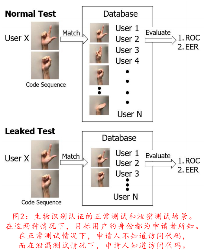 在这两种情况下,对于mth代码,真正的得分,Gm,是从真正的用户的认证手势Gm中获得的。在正常测试中,冒名顶替者的分数Im是由其他用户所做的其他手势获得的。对于泄露测试场景,所有其他用户的Im都是从Cm获得的。使用Gm和Im实施融合方案,以获得最终的FARM、FRRM和EERM。