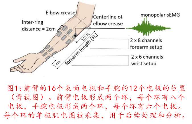 在实验之前,受试者从尺骨茎突到尺骨鹰嘴之间的距离作为前臂长度被测量。前臂周长的测量是在尺骨鹰嘴到前臂三分之一处进行的。手腕周长是在距离尺骨茎突2厘米处测量的。这些测量完成后,将电极放在前臂和手腕上。对于前臂电极的放置,16个单极sEMG电极(AM-N00S/E,Ambu,丹麦)以两个环的形式放置,每个环由8个电极组成,均匀分布在前臂周围,形成8个双极对。两个环之间中心到中心的距离保持在2厘米。对于手腕的电极设置,12个与前臂环相同类型的单极sEMG电极以两个环的形式放置,每个环由六个电极组成,平均分布在手腕周围,形成6个双极对。两个环之间中心到中心的距离保持在2厘米,与前臂设置相似。因此,每个阶段共使用了28个单极sEMG电极。图中提供了详细的图示说明。1,而实际的电极定位见附录一。图1中提供了详细的图示说明,而实际的电极定位则可参考附录一。为了保持所有参与者的电极位置的一致性,每个环中的第一个电极(总环数=4)结构上被定位在肘部皱褶的中心线上,如图1所示[6,11]。
