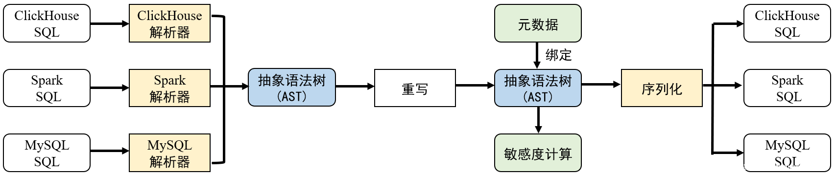 - · 采用定制化的SQL重写机制(rewriter),可支持多种语法特征,例如聚合函数、多层子查询、join、group by等。