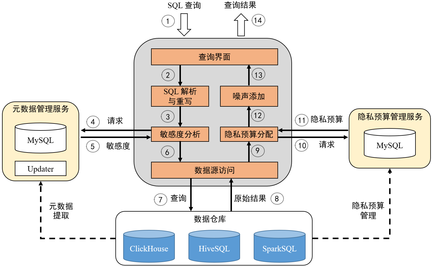 DPSQL核心服务:以原始SQL统计查询语句作为输入,输出满足差分隐私的结果,其中包括SQL 解析与重写、差分隐私加噪等模块;