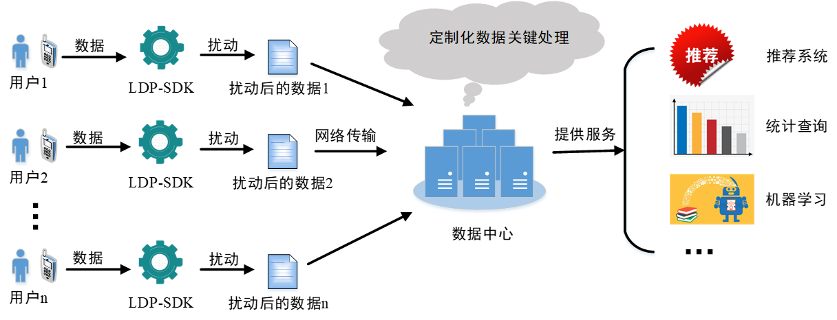 LDPDC服务以本地化差分隐私(Local Differential Privacy)[2]为核心技术,为用户提供端上的LDP-SDK,实现端上的数据的扰动处理。同时,配套提供了服务端的计算服务,对LDP-SDK采集的数据进行汇总分析。同样地,LDPDC面临以下挑战: