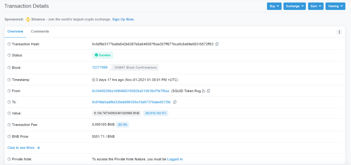 目前可以确定的消息是,鱿鱼币项目发行方已卷款跑路,涉及钱款高达338万美元。项目创始人通过TornadoCash协议隐藏交易细节,进而转移资金,并将如今一文不值的鱿鱼币早早兑换了等值的币安币(BNB)。