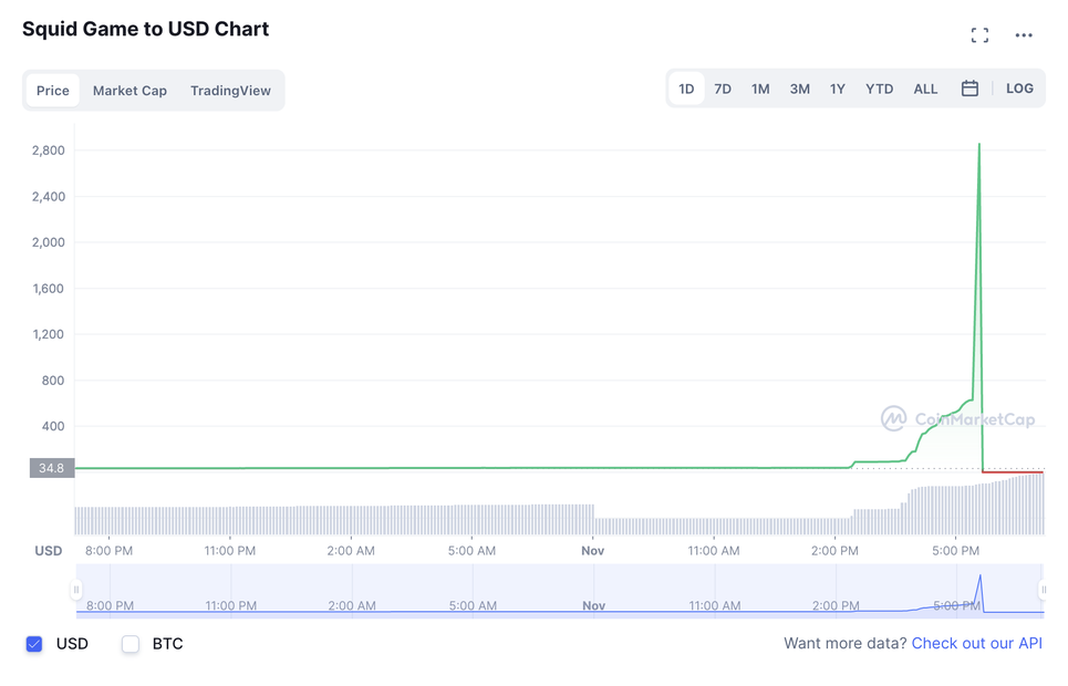接下来的三天时间,眼热的币圈玩家们,疯狂涌向鱿鱼币交易市场,鱿鱼币价格一路飙升,在11月1日崩盘前更是翻了83000%达到2861.8美元。就是这样一个全球涨幅第一虚拟货币,在币价一路水涨船高后,只用了几分钟暴跌至0美元,在线上演价格大跳水。