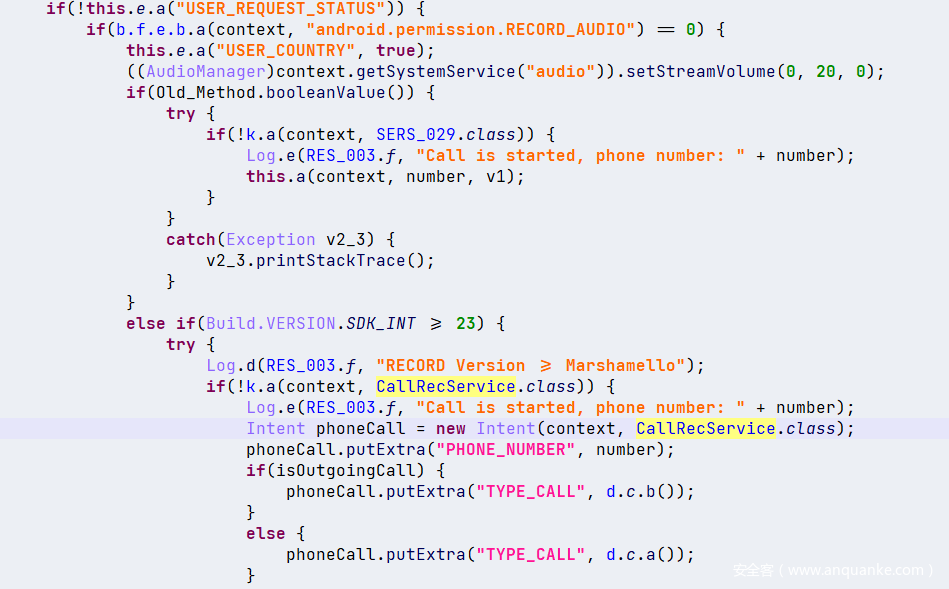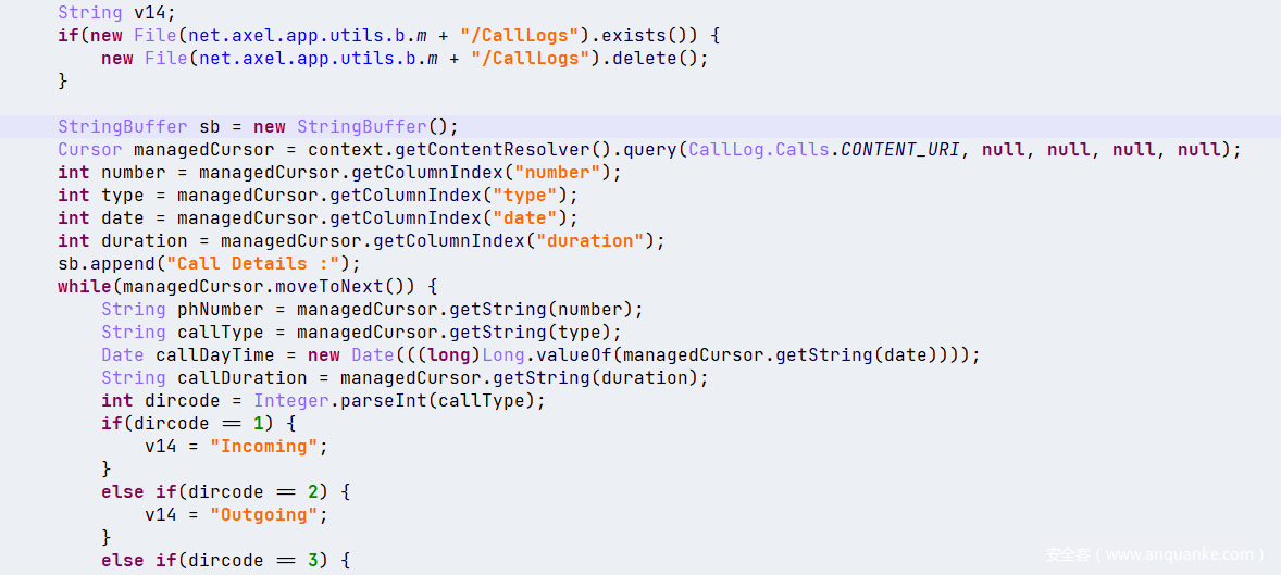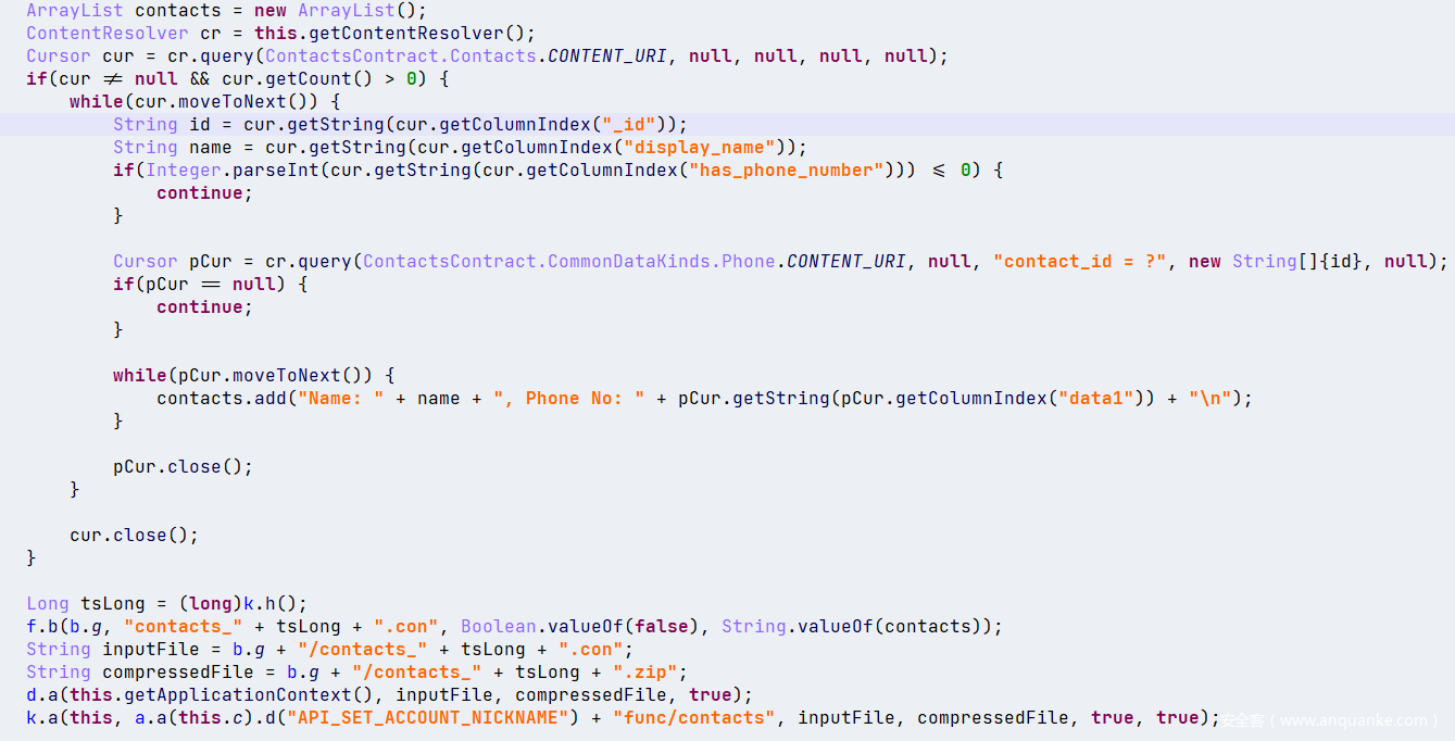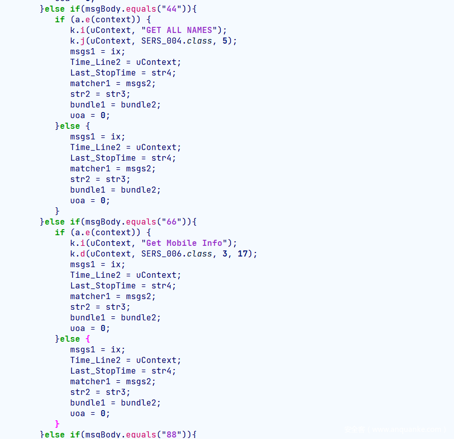 恶意程序的主要远程功能为:获取用户通讯录、获取短信、获取通话记录、获取图片、获取指定格式的文件、获取安装应用列表、拦截获取指定聊天软件的通知消息、通话录音、录音、截屏、调用系统相机拍照、启用WIFI等。