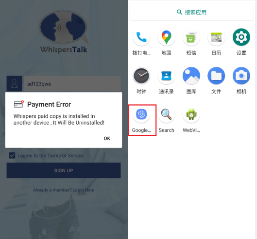 当用户进行注册此应用时,会弹出警告:提示将卸载此应用,实际是恶意软件将根据手机安卓版本选择更改图标或隐藏桌面快捷方式。