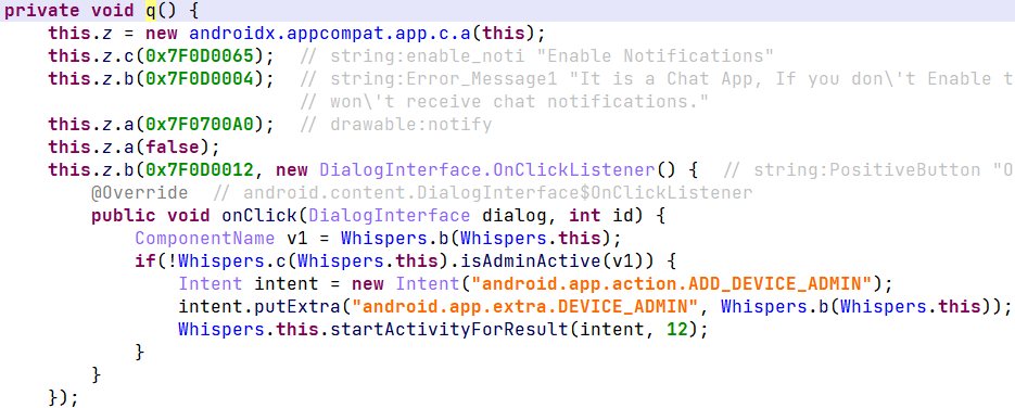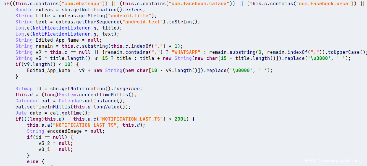 近期,暗影实验室的态势感知平台捕获了几款此类的间谍软件,此类恶意程序仿冒成正常的交友聊天类软件,诱导用户下载安装并同意权限和无障碍通知,在注册使用时会根据安卓版本选择隐藏或更改应用图标,隐藏活动入口,防止用户主动杀后台,后台运行通过FCM(Firebase Cloud Messaging)消息传递和SMS短信并远程操控手机执行监听并上传用户隐私信息,会通过进行远控指令的下发。
