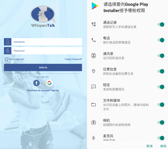 该恶意应用仿冒聊天类应用,诱导用户安装并设置“android:targetSdkVersion=”22”,仿冒GoolePlay一次性申请所有权限隐私权限。