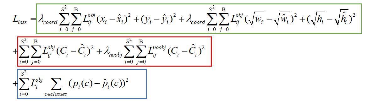 整个公式由三部分组成,第一部分为绿色方框中的内容,表示第i个网格中的第j个bbox是否负责这个Object,称为坐标预测;第二部分为红色方框中的内容,分别是含有Object的bbox的置信度预测与不含Object的bbox的置信度预测,统称置信度预测;第三部分为蓝色方框中的内容,表示是否有Object中心落在网格i中,称为类别预测。与分别为权重系数。