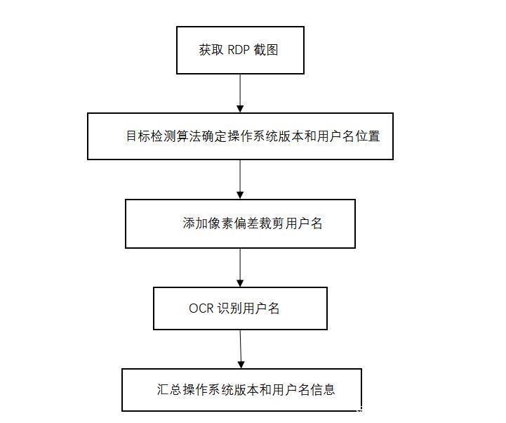 以虚拟的攻,促真实的防。站在攻击者的角度,解决问题的思路如下:通过RDP协议获取到目标主机的远程桌面登录截图,利用目标检测算法获取目标主机的操作系统版本和用户名位置。考虑到用户名字符存在多种多样的形式,我们将识别到的用户名位置在宽、高上分别设置一定的像素偏差,然后将其裁剪出来,利用ocr模型识别出具体的字符。最后,汇总每个主机的操作系统版本与用户名信息进行返回。