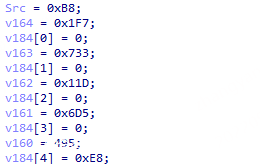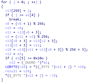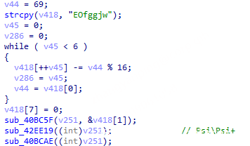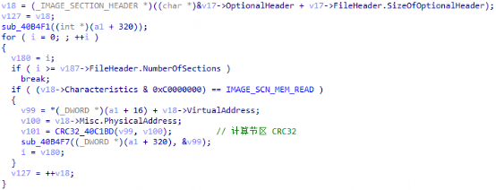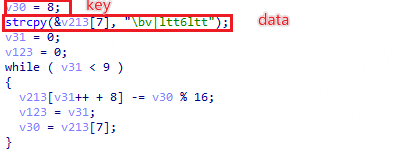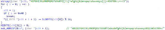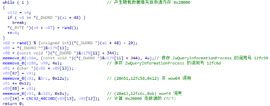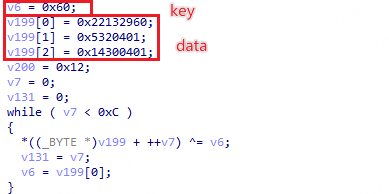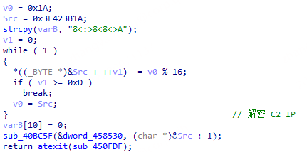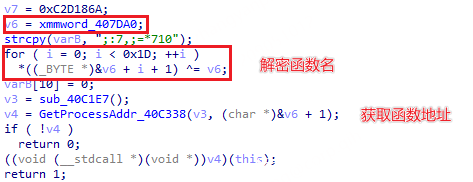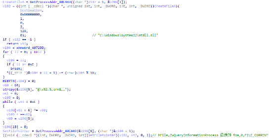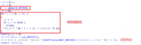 1.1>该木马使用的关键 API 名称和字符串均被加密,在使用时再进行实时解密且每次解密时使用的算法及 KEY 不尽相同,这种方式不仅隐藏了自身的静态特征,还避免了分析人员使用统一的解密算法解密其所有的字符串。