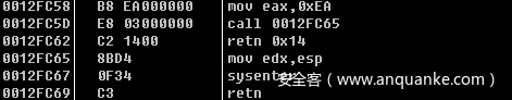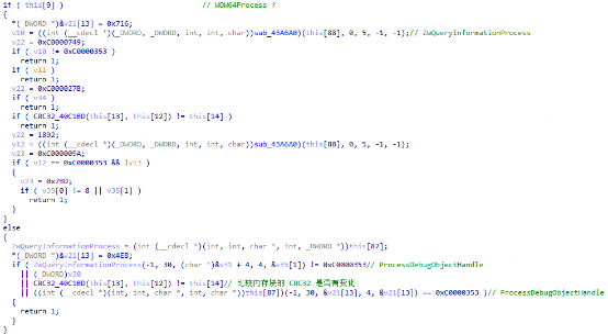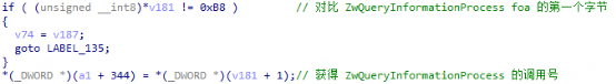 调用 ZwQueryInformationProcess 函数检测进程调试对象句柄进行反调试,但是其并没有直接调用当前进程中的 ZwQueryInformationProcess 函数,而是通过获取 ntdll.dll 文件中 ZwQueryInformationProcess 函数的调用号然后自己实现了该函数,最后调用自己实现的 ZwQueryInformationProcess 函数进行反调试,这种调用方式避免了 r3 层对该函数的 HOOK。