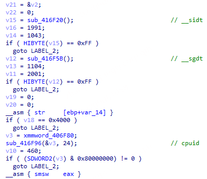 反虚拟机:检测 IDT、GDT 的地址和 cpuid 的值。