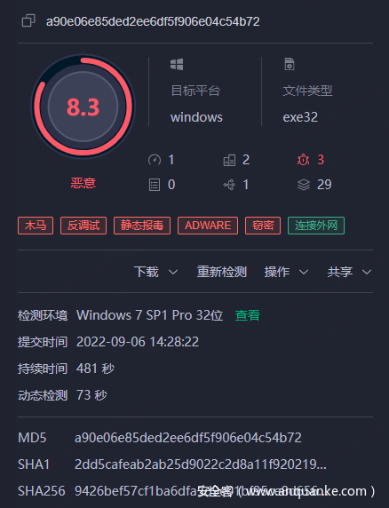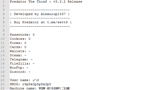 该样本是 Predator the Thief 窃密木马的 v3.3.2 版本,其主要功能是窃取失陷主机上浏览器客户端、邮箱客户端、FTP客户端、虚拟币钱包等保存在主机上的用户数据。该木马使用了一系列的技术来避免其被调试分析,并且其在运行过程中还会向 C2 请求一次配置数据用于决定是否开启反虚拟机、区域豁免等功能。