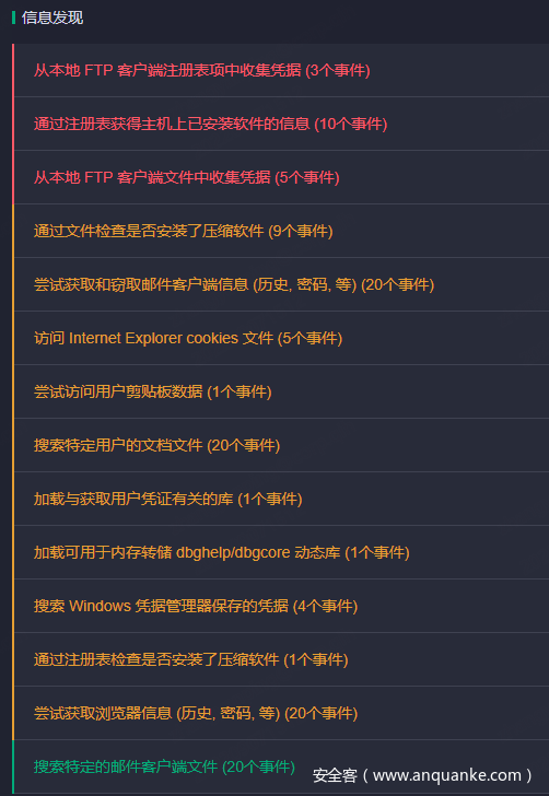 7, 窃取数据,窃取的数据涵盖多种类型软件包括浏览器、邮箱、FTP、VPN、即时通信等。与其他窃密软件不同的是其在窃密过程中不会让窃取的数据落地,而是将窃取的数据存放在内存中,最后直接以压缩包的格式发送给 C2。