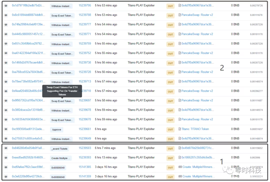 2.第二部分将Ticket Titano代币转换成BNB,攻击者首先通过StakePrizePool合约将Ticket Titano代币代币转换成TITANO代币,随后通过PancakeSwap将得到的TITANO代币兑换成BNB,一共获得约4828枚BNB。
