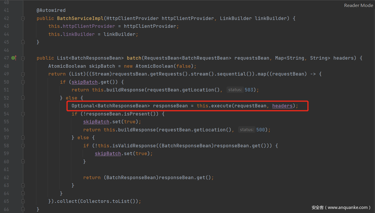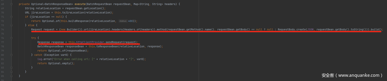 在如图所示代码,实际负责发送HTTP请求。其中batchService接口的实现类BatchServiceImpl位于com.atlassian.jira.plugin.mobile.service.impl.BatchServiceImpl.class