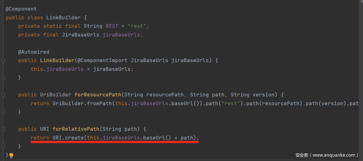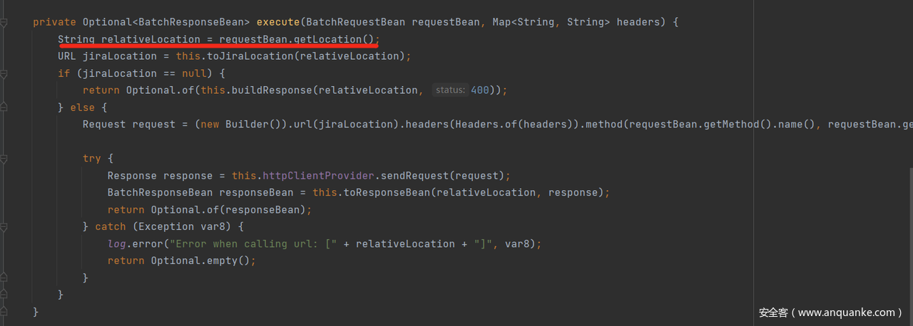 因为URL的后半部分是可控的,如果我们简单指定location为@xx.com,那么最终的URL为https://jira-host.com@xx.com,httpClientProvider实际上会对xx.com发送http请求,所以导致了SSRF漏洞产生。