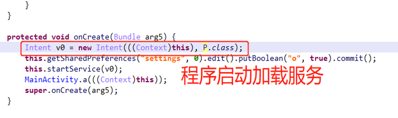该程序采用传统的启动方式,即MainActivity的onCreate方法,随后通过Intent跳转到后台服务执行恶意操作。