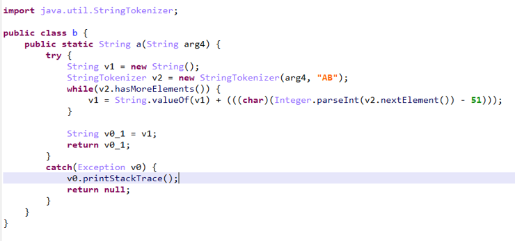 将拿到的本地数据通过拟写好的解密算法解密,该算法即是将拿到的字符串以“AB”字符分割,随后将分割出的字符逐个解析成整型进行算数运算(将所有值-51)最后再重组成新的字符串得以返回。