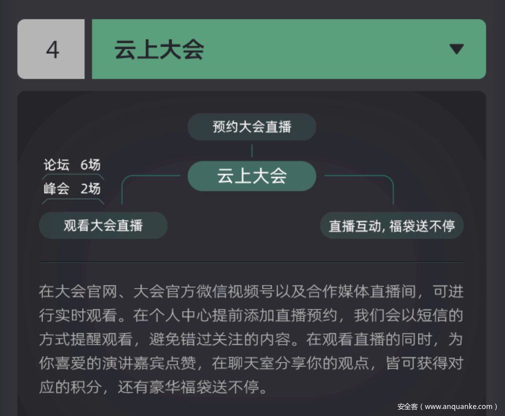 4.云上大会:在大会官网、大会官方微信视频号以及合作媒体直播间,可进行实时观看。在个人中心提前添加直播预约,我们会以短信的方式提醒观看,避免错过关注的内容。在观看直播的同时,为你喜爱的演讲嘉宾点赞,在聊天室分享你的观点,皆可获得对应的积分,还有豪华福袋送不停。