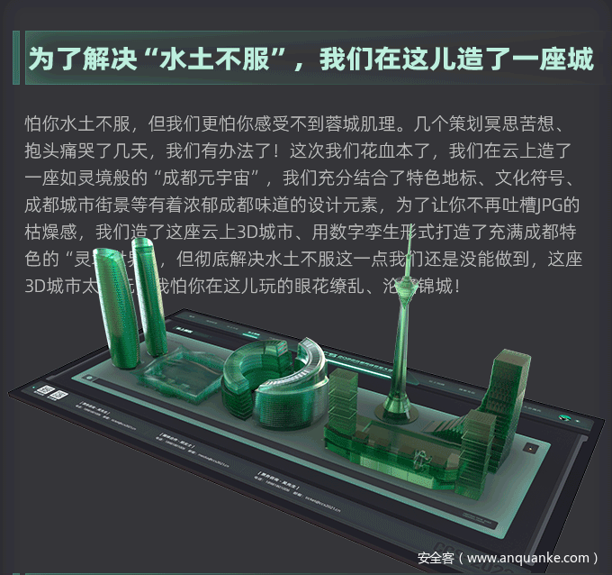 怕你水土不服,但我们更怕你感受不到蓉城肌理。几个策划冥思苦想、抱头痛哭了几天,我们有办法了!这次我们花血本了,我们在云上造了一座如灵境般的“成都元宇宙”,我们充分结合了特色地标、文化符号、成都城市街景等有着浓郁成都味道的设计元素,为了让你不再吐槽JPG的枯燥感,我们造了这座云上3D城市、用数字孪生形式打造了充满成都特色的“灵境世界”,但彻底解决水土不服这一点我们还是没能做到,这座3D城市太好玩,我怕你在这儿玩的眼花缭乱、沦陷锦城!