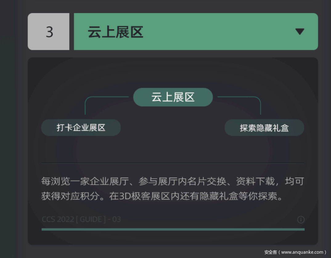 3.云上展区:每浏览一家企业展厅、参与展厅内名片交换、资料下载,均可获得对应积分。在3D极客展区内还有隐藏礼盒等你探索。