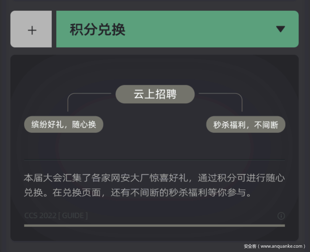积分兑换:本届大会汇集了各家网安大厂惊喜好礼,通过积分可进行随心兑换。在兑换页面,还有不间断的秒杀福利等你参与。