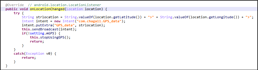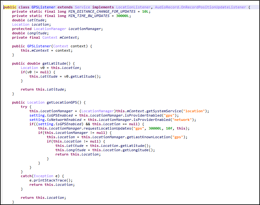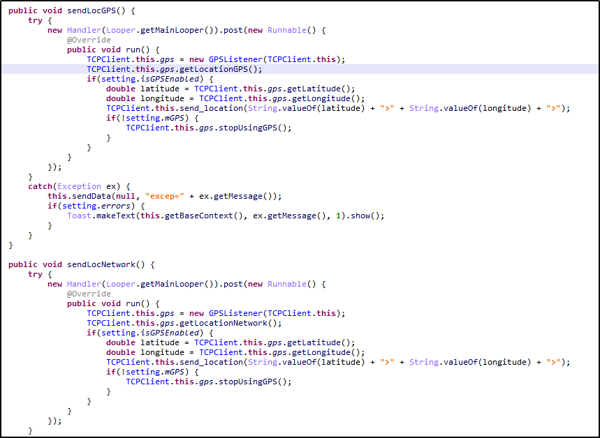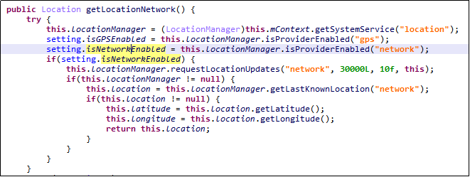 该恶意软件还可以通过GPS和当前联网状态定位获取用户的经纬度,可随时定位用户的位置,方便记录用户的生活轨迹。