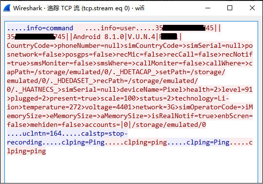 三次握手后,控制端先通过tcp协议发送info=command指令获取用户手机基本信息,如表4-3-7 远控指令列表所示的info指令,报文的特征如下: