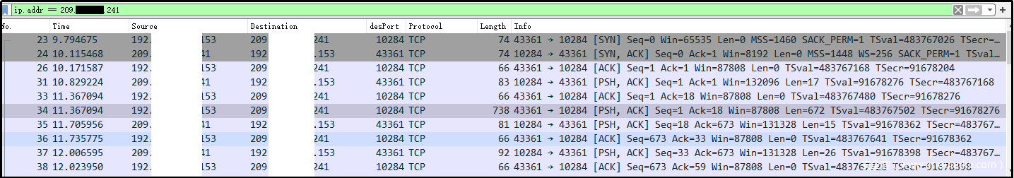 通过抓包发现恶意程序和C&C之间的通信,使用的是TCP协议,如下所示: