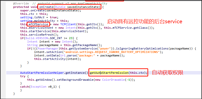 恶意间谍软件在安装后,无需用户同意,会自动激活所有权限。并且启动具有远控功能模块的service。