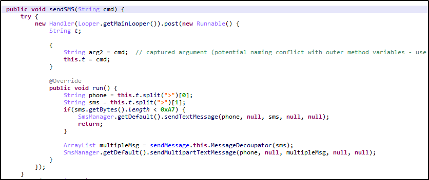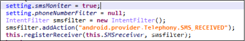 黑客可以通过远程控制,打开短信监听器smsMoniter,并拦截用户收到的短信。这种手段多出现在银行木马,用于获取用户的银行卡的手机验证短信。