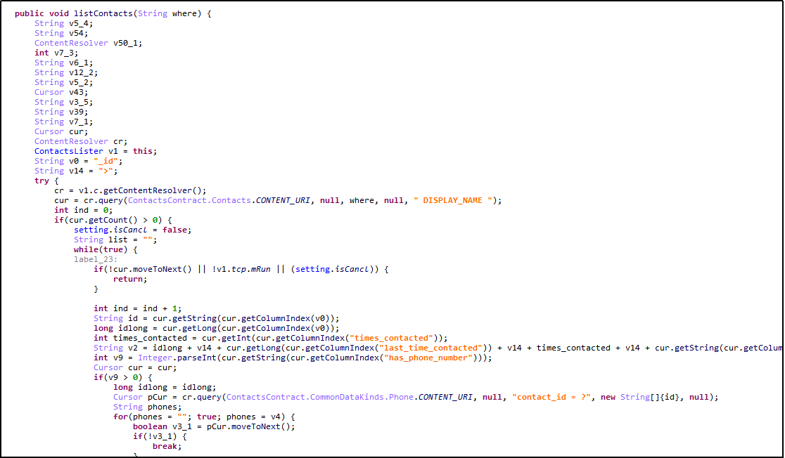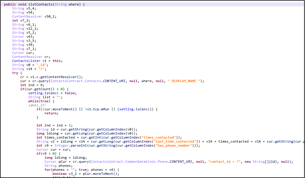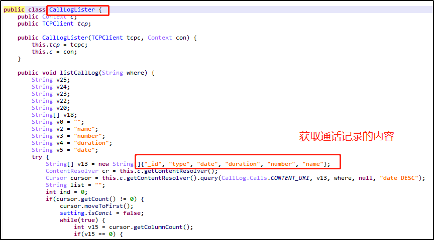 恶意间谍软件获取用户手机的通讯录列表,包括通讯录的电话号码、姓名以及存储的联系人照片。如下图所示方法: