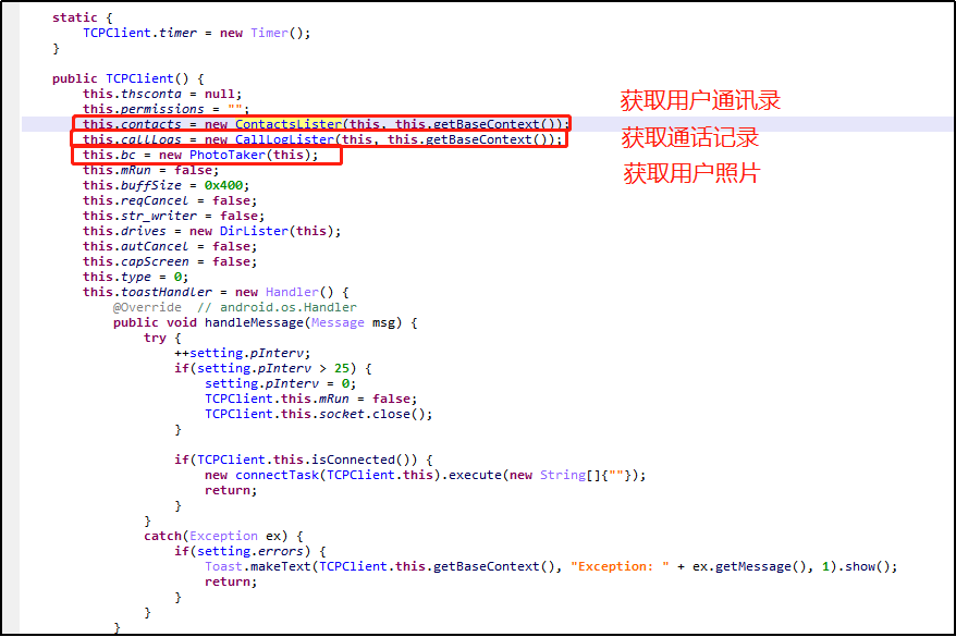 如上图所示,安装app后,通过开机、打开应用、警告监听等方式启动TCPClient线程,自动获取用户通讯录、通话记录和照片等。