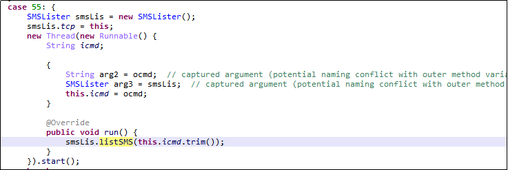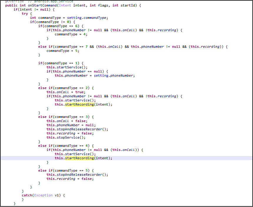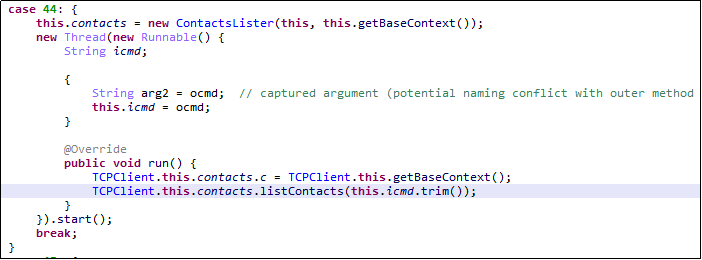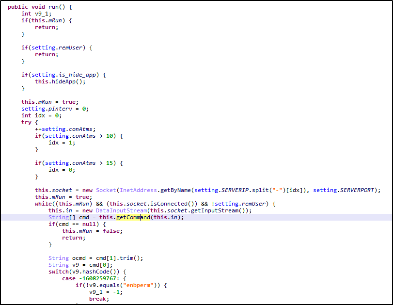 Android RAT最重要的核心功能是远控,在应用安装启动后,间谍软件先会和C&C服务器通信,远控上线,通过getCommand方法进一步获取远控指令,并获取用户隐私。