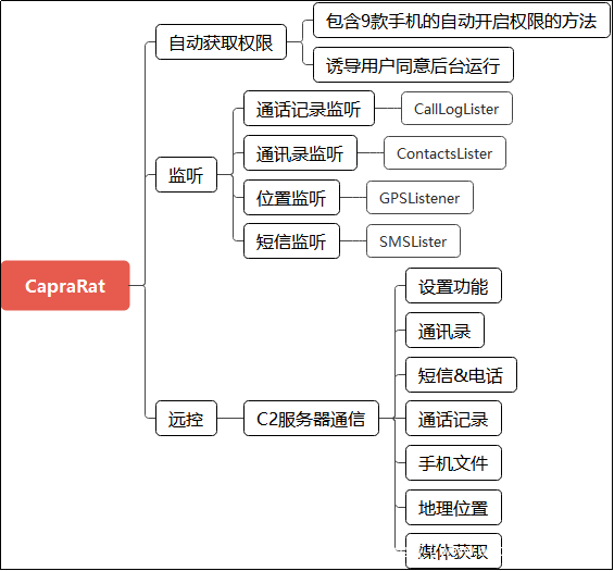 该CapraRat间谍软件恶意软件安装后,会识别手机厂商,并自动获取权限,然后诱导用户同意后台运行,并且启动监听用户的隐私信息,包括用户的通讯录、短信内容、通讯记录和用户定位,远程操控用户手机,执行发送短信、拨打电话、修改设置、录音和上传文件等恶意操作,CapraRat间谍软件的运行流程图3-1所示。