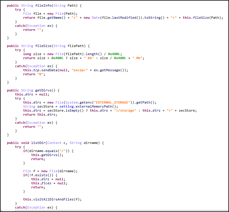 手机在安装恶意间谍软件后,会远程获取用户的文件列表,在此处还有其他远程操作手机文件的行为,包括文件的上传、删除。恶意操作用户手机存储的文件,包括照片、视频和录音文件。