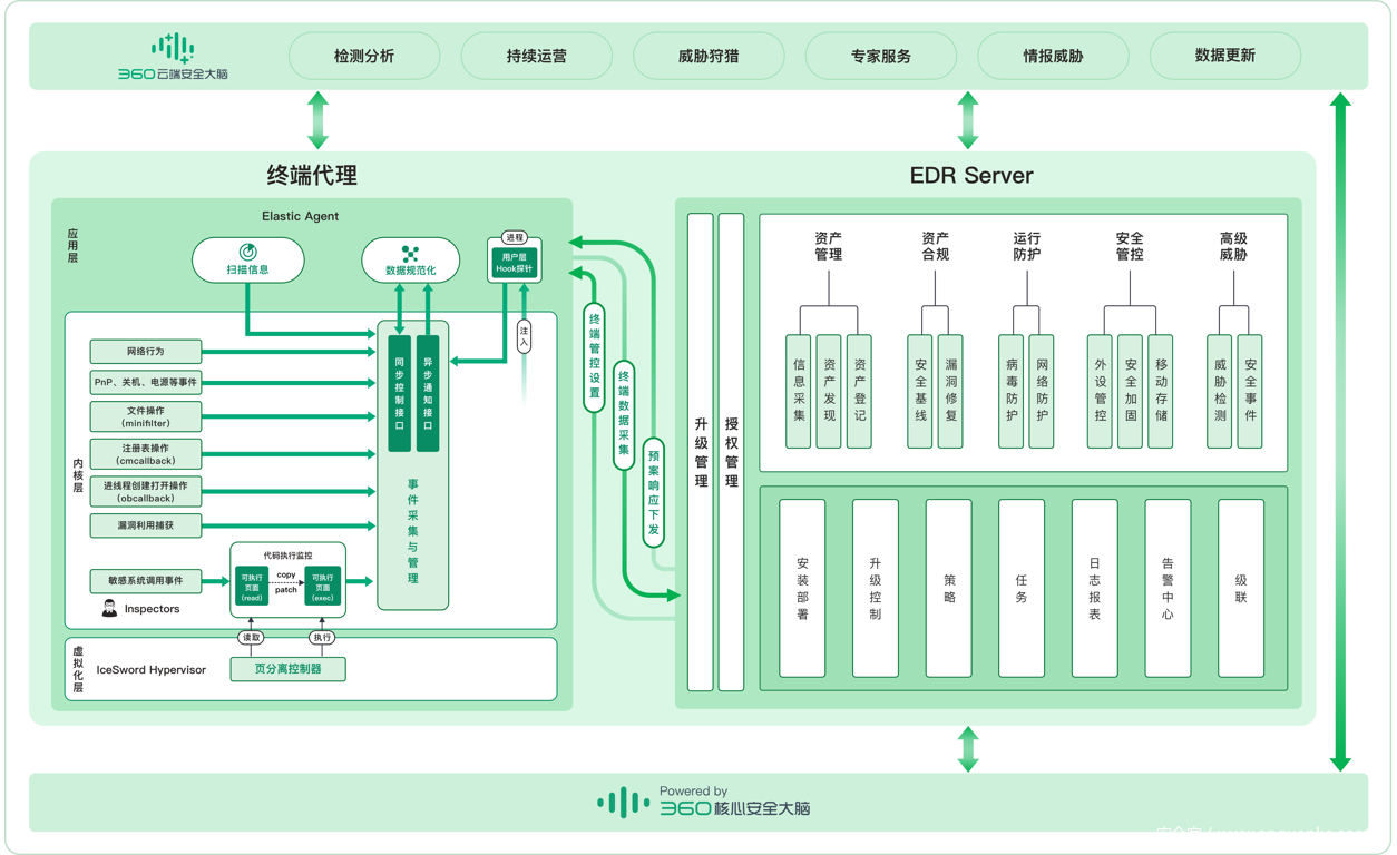 作为面向未来的终端安全产品,从构成上360 EDR技术架构分成三个部分:终端代理、EDR Server、360核心安全大脑。其中终端代理是360 EDR的核心组成部分,360 EDR依托于360云端核心安全大脑的持续赋能、360核心安全大脑的安全大数据平台充分发挥终端代理的采集和处置能力,同时通过EDR Sever的高效数据分析引擎,最终实现对高级威胁的检测和抑制。
