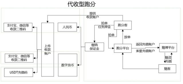 以高额兼职返利为诱饵,吸引并发展大量正常用户为其提供支付账号,从而将涉诈资金流水隐匿与正常用户的资金流水中,逃避追溯,这便是跑分平台经典的操作方式。根据支付产业的不同,其分为代收型跑分、代付型跑分;根据跑分抵押物的不同,分为人民币跑分、虚拟货币跑分。