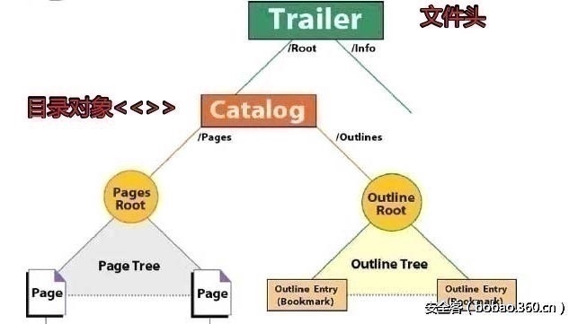 文件尾说明了根对象的对象号,并且说明交叉引用表的位置,通过对交叉引用表的查询可以找到目录对象(Catalog)。这个目录对象是该PDF文档的根对象,包含PDF文档的大纲(outline)和页面组对象(pages)引用。大纲对象是指PDF文件的书签树;页面组对象(pages)包含该文件的页面数,各个页面对象(page)的对象号。