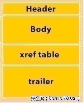 文件尾——声明了交叉引用表的地址,即指明了文件体的根对象(Catalog),从而能够找到PDF文件中各个对象体的位置,达到随机访问。另外还保存了PDF文件的加密等安全信息。