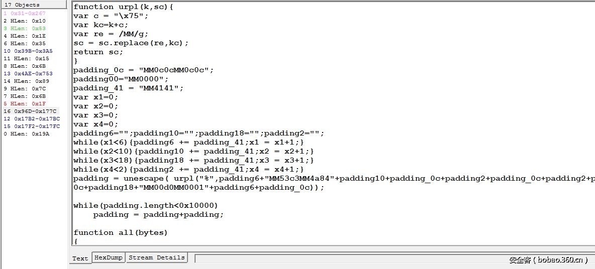 下面的图片是提取自样本中的PDF steam流文件中的js脚本,已经很明显是攻击代码了: