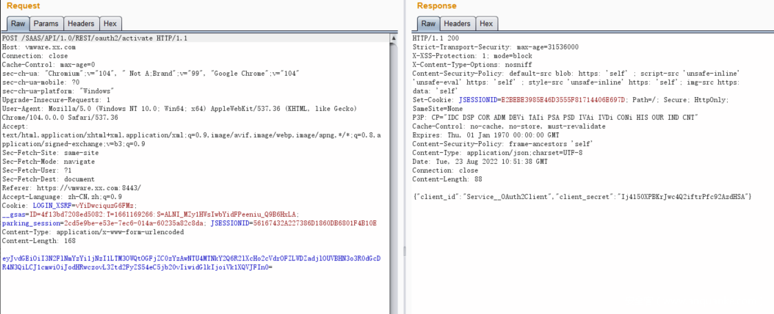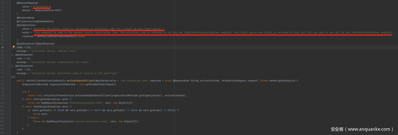 接着在com.vmware.horizon.rest.controller.oauth2.OAuth2TokenResourceController#activateOauth2Client上方注解说明得很清楚,通过交换activationToken也就是前面获取到的激活码来激活oauth2客户端,获取 client ID 和 client secret,用于/SAAS/auth/oauthtoken做身份认证。